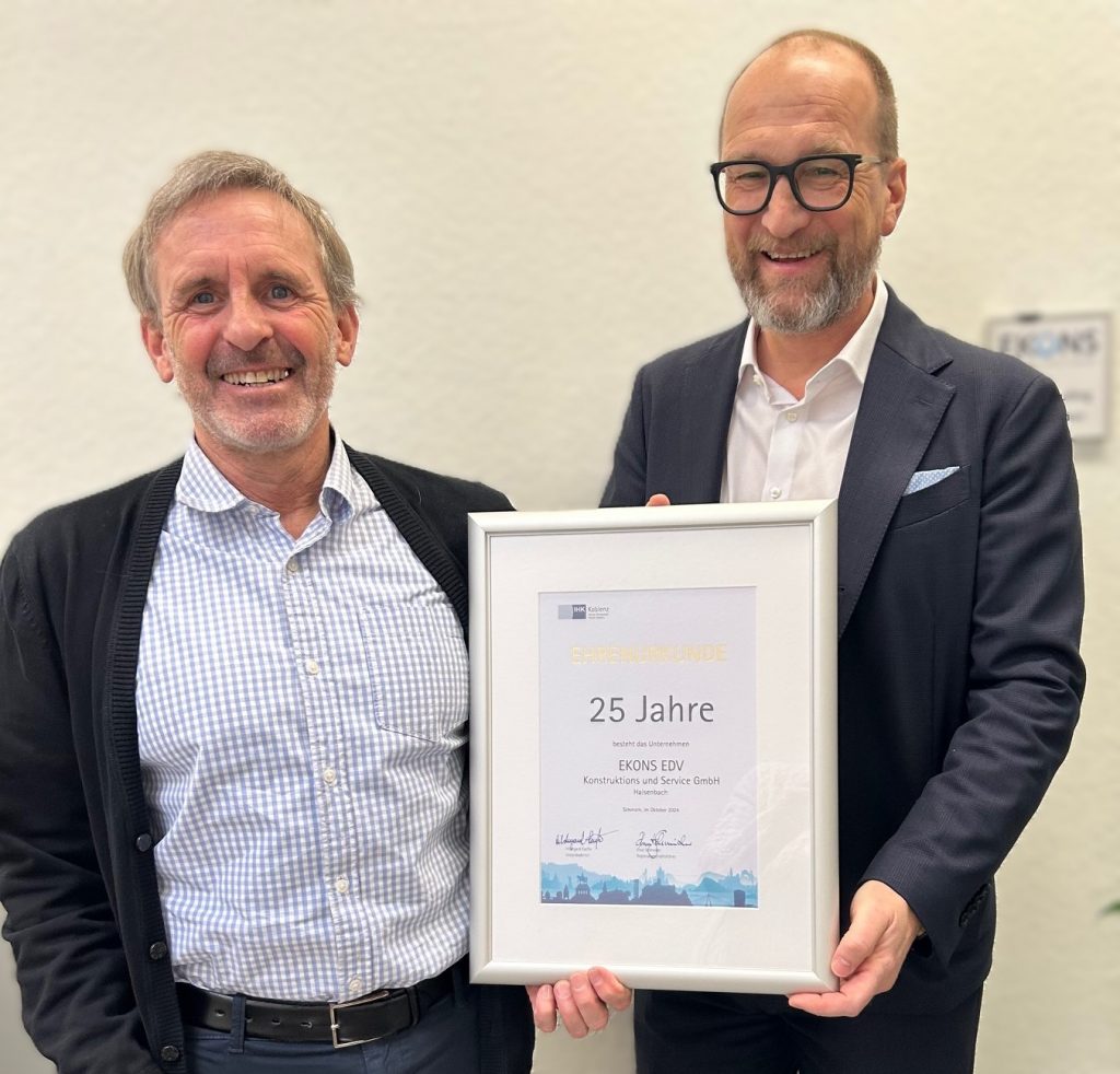 25 Jahre EKONS: Gratulation zum Meilenstein durch Knut Schneider (im Bild rechts, Geschäftsführer des Wirtschaftsraums Rhein-Hunsrück und Cochem-Zell bei der IHK Koblenz).
